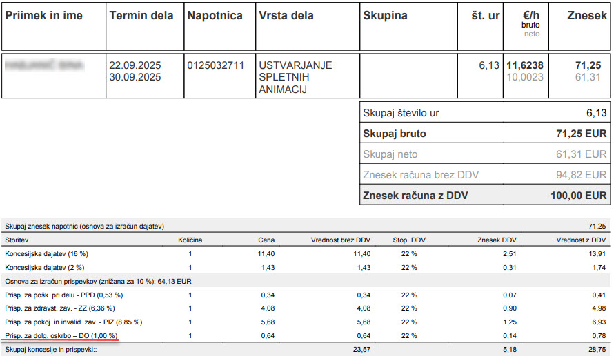 ▶ Za delo od 1. 7. 2025 dalje je na računu za študentsko delo obračunan tudi prispevek za dolgotrajno oskrbo (PDO) po stopnji 1 %.